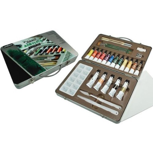 Coffret en métal contenant 20 tubes de peinture acrylique Pébéo Studio, une palette, des pinceaux, des couteaux, des crayons et des accessoires.