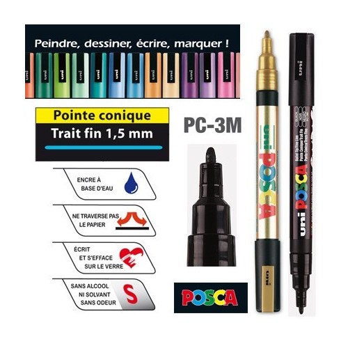 Marqueur POSCA PC-3M. Pointe fine conique. Largeur du trait : 1,5 mm. Marqueurs peinture à base d'eau et de pigments inaltérables. La peinture à base d'eau et de pigments naturels de la gamme POSCA offre un fort pouvoir couvrant, ainsi qu'une résistance exceptionnelle sur d'innombrables supports. Ecrit sur les vitres et s'efface à l'aide d'un chiffon humide.
